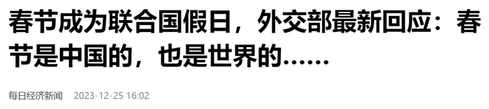 《每日经济新闻》12月25日的报道:日前,联合国通过决议将春节(农历新年)确定为联合国假日。