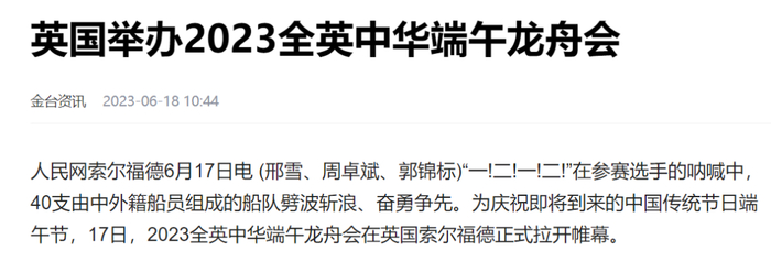 英国也有类似举动,人民网索尔福德2023年6月17日电:为庆祝即将到来的中国传统节日端午节,17日,2023全英中华端午龙舟会在英国索尔福德正式拉开帷幕。