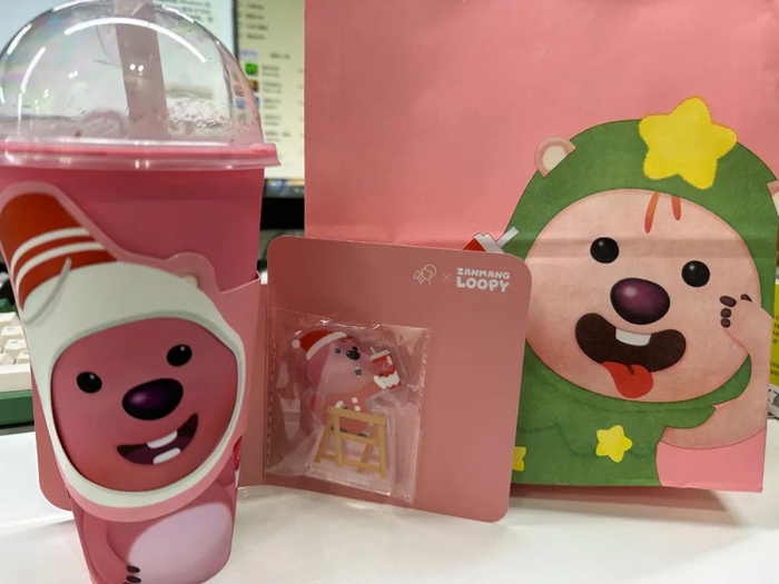 Loopy甚至可以说是无处不在。从毛绒玩偶、盲盒、抱枕,到美妆、染发剂、蛋糕……甚至,Loopy还可能长得像你身边的某个朋友。不知不觉间,一股粉色风暴席卷而来,总有一个“Loopy”在你附近,比如隔壁正在喝喜茶同款女明星特饮的同事。