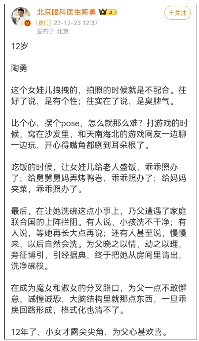 长文中,陶勇称他在女儿生日当天要求她洗碗,遭到全家人反对,有人说小孩洗不干净,有人说等她长大点再说,还有人说慢慢来以后自然会洗。最后陶勇极力游说,终于把女儿从房间里请出来洗碗。