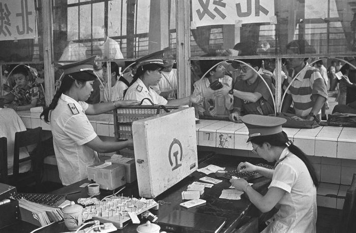 ↑1981年,上海铁路局上海客运站的售票员,正在使用计算机控制的售票机售票。新华社记者张平摄