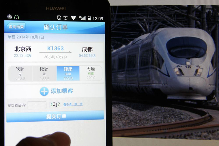 ↑2014年9月12日,一名北京市民通过12306手机客户端订购国庆首日火车票。新华社发