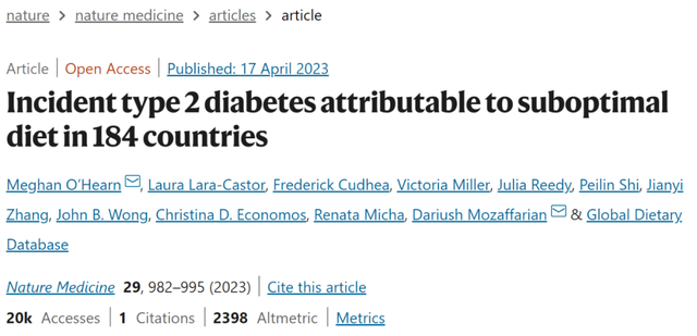 其中,不健康饮食是糖尿病的危险因素之一。2023年4月发表在《自然·医学》的一项分析显示:全球每年有1410万新发2型糖尿病患者,可以归因于11条不良饮食因素,意味着全球七成的2型糖尿病是“吃出来的”!