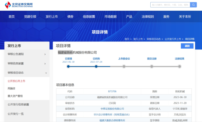 2023 年 7 月 24 日,发行人收到《关于福建省铁拓机械股份有限公司公开发行股票并在北交所上市申请文件的审核问询函》。根据《北京证券交易所向不特定合格投资者公开发行股票注册管理办法》《公开发行证券的公司信息披露内容与格式准则第 46 号——北京证券交易所公司招股说明书》《公开发行证券的公司信息披露内容与格式准则第 47 号——向不特定合格投资者公开发行股票并在北京证券交易所上市申请文件》《北京证券交易所股票上市规则(试行)》等规定,保荐机构质量控制部门对首轮问询回复及相关工作底稿进行了全面审核,证券发行审核部对首轮问询回复进行再次审核。
