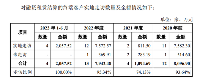 对融资租赁结算的终端客户实地走访数量及金额情况如下: