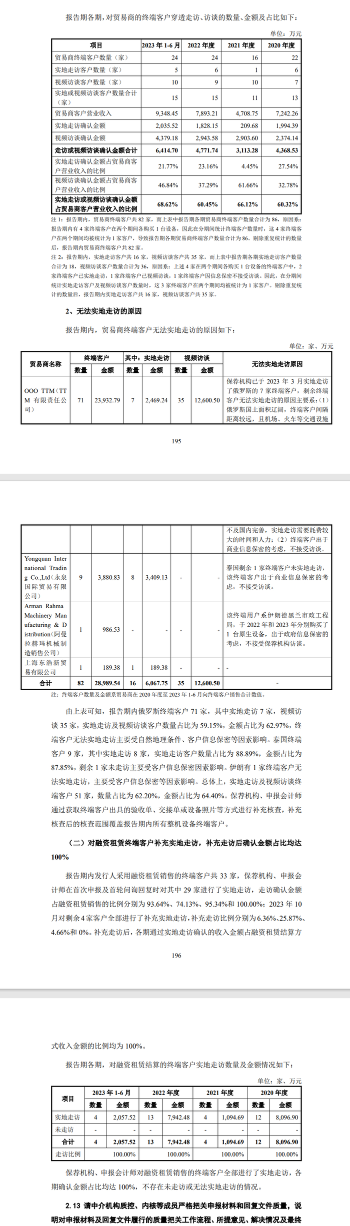 如上表所示,2021 年度对融资租赁销售终端客户的实地走访比例为 74.13%,相对较低,主要是由于本年度融资租赁方式销售收入仅 1,094.69 万元,终端客户数量仅 4 家,其中 2 家终端客户的销售金额较低,分别为 199.12 万元和 84.07 万元,因此未对该 2 家客户进行实地走访。2020 年度和 2022 年度分别有1 家客户未进行走访,系该两家客户未积极配合接受访谈,考虑对应年度对融资租赁终端客户的整体走访比例分别已达到93.64%和 95.34%,故未再对这 2 家客户进行实地走访。
