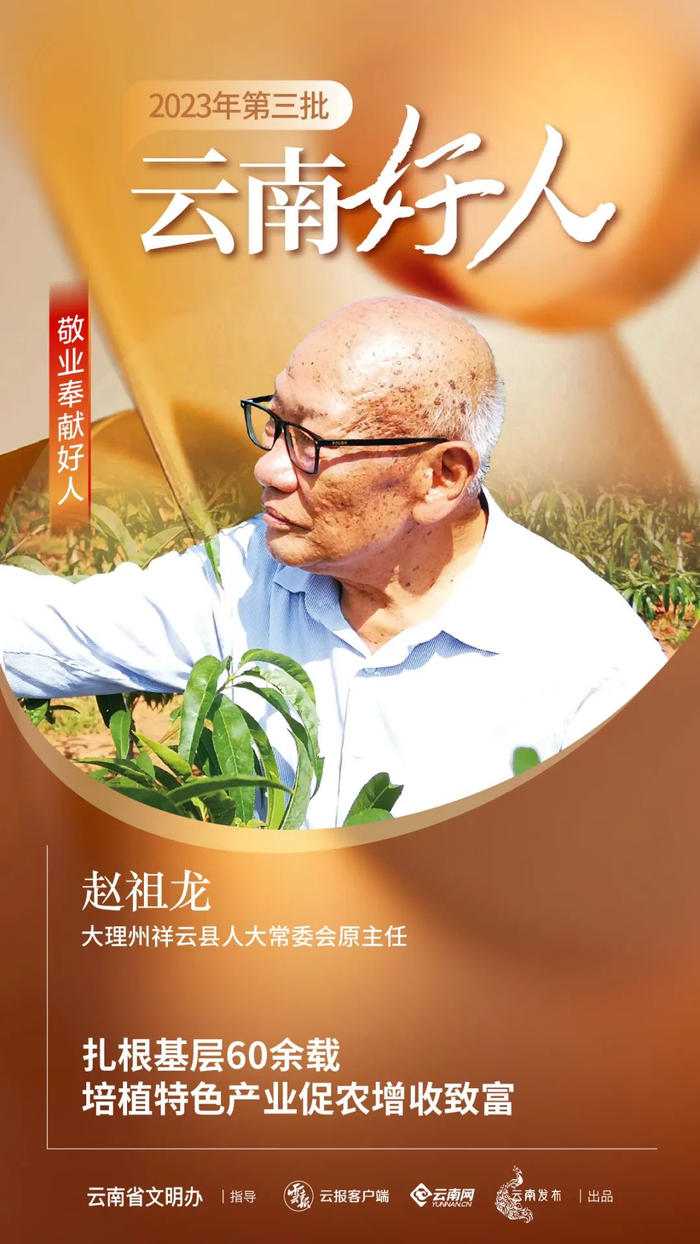 赵祖龙,男,1939年11月生,中共党员,大理州祥云县人大常委会原主任。作为一个“退休不离岗,技术不离身”的老人,赵祖龙60多年如一日,心系群众、情系农业,开展农业推广工作,造福群众。先后被表彰为“全国离退休干部先进个人”“云南省优秀共产党员”、云南省“有突出贡献的优秀专业技术人才”。