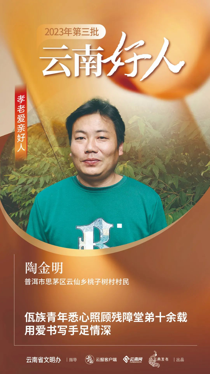 陶金明,男,1988年2月生,普洱市思茅区云仙乡桃子树村村民。陶金明的堂弟陶永生在3岁时被诊断为先天性智力残疾,陶永生的母亲离家出走、父亲因病去世后,陶金明便将堂弟陶永生接到了自己家中。2012年,陶金明结婚后,夫妻俩一如既往照顾堂弟陶永生,至今已有十余年。在他的言传身教下,两个儿子从小就帮着一起照顾叔叔,一家人用爱心诠释了手足情深。