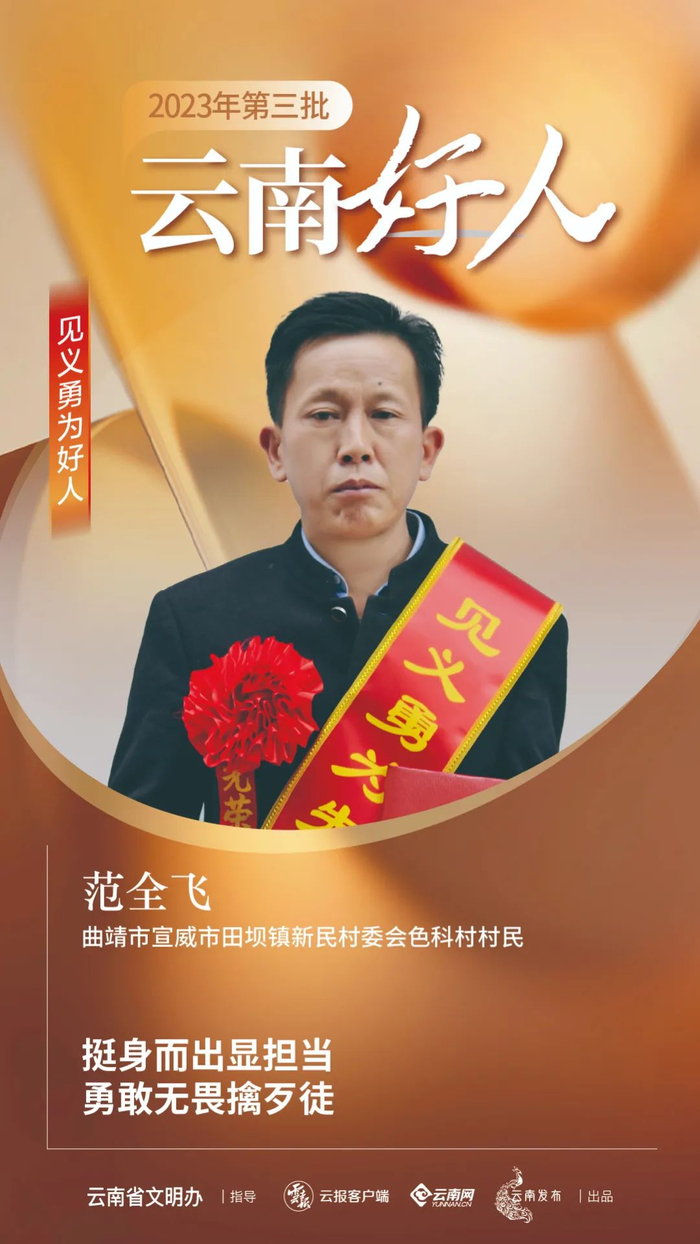 范全飞,男,1979年5月生,曲靖市宣威市田坝镇新民村委会色科村村民。2022年2月6日,在客运车上,面对穷凶极恶的持刀歹徒,范全飞不顾自身安危,挺身而出与歹徒搏斗,全身多处受伤,最后在其他乘客的协助下,将歹徒制服并移交公安机关。范全飞被评为“云南省2022年度见义勇为先进个人”。