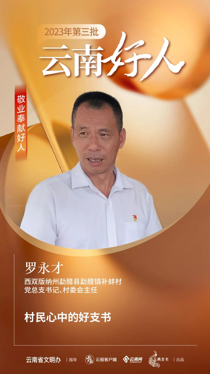 罗永才,男,哈尼族,1976年生,中共党员,西双版纳州勐腊县勐腊镇补蚌村党总支书记、村委会主任。他总是把群众放在心头、把责任扛在肩上,用行动带领群众描绘乡村振兴美丽画卷,收获了群众满满的称赞。补蚌村先后被评为“云南省民主法治示范村”“全国民主法治示范村”“国家级森林乡村”。罗永才先后被表彰为西双版纳州第六届“劳动模范”、云南省脱贫攻坚奖“扶贫好村官”、“全国脱贫攻坚先进个人”。