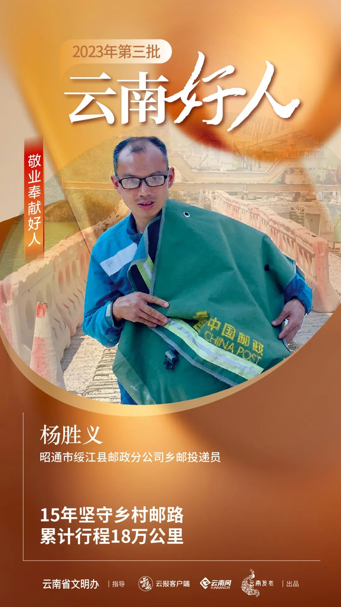 杨胜义,男,1975年1月生,昭通市绥江县邮政分公司乡邮投递员。15年来,他在绥江县最难行邮路之一的农业—大沙—互助邮路上,累计投递邮件、送出包裹数量达8万余件,从未丢失一封邮件、一个包裹;投递途中他无偿为村民捎带物品1.5万余件,返回途中帮群众带农特产入城销售。他用行动践行着“人民邮政为人民”的宗旨,先后被评为昭通市第五届“劳动模范”、云南省2021年“最美快递员”、昭通市2023年“敬业奉献道德模范”。
