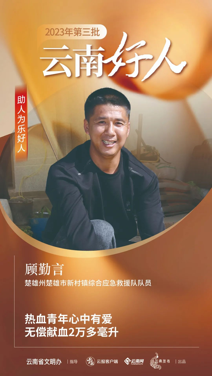 顾勤言,男,1988年生,楚雄州楚雄市新村镇综合应急救援队队员。自2010年以来,他先后献血58次,总献血量22800毫升,两次荣获“全国无偿献血奉献奖金奖”。只要得知有输血需求,无论是邻里乡亲,还是陌生人,顾勤言总是尽力给予帮助。楚雄州中心血站的工作人员经常说:“无偿献血,顾勤言总是第一个。”在顾勤言看来,献血只是一件平常事,只要身体条件允许,他会一直坚持。
