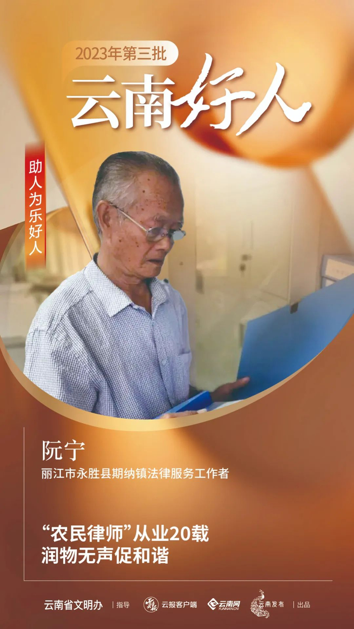 阮宁,男,1948年生,丽江市永胜县期纳镇法律服务工作者。从事基层法律服务工作20多年来,阮宁经常骑着电动车走村串寨,开展法律宣传,义务为群众提供法律服务、法律援助,每年法律咨询案件数都在500件以上。他是全省基层法律服务工作者中最年长的一位,被当地群众亲切地称为“农民律师”。2018年,他被评为“全省人民调解工作先进个人”。