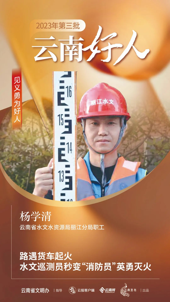 杨学清,男,汉族,1987年3月生,云南省水文水资源局丽江分局职工。2023年8月23日下午,一辆载满货物的大货车在丽江市宁蒗县泸沽湖至红桥乡的公路上突然自燃,外出工作的杨学清和同事发现险情后秒变“消防员”,迅速到路边寻找水源,一起用水质监测取样桶接力取水,合力将火扑灭,使满车货物得以完好保全。