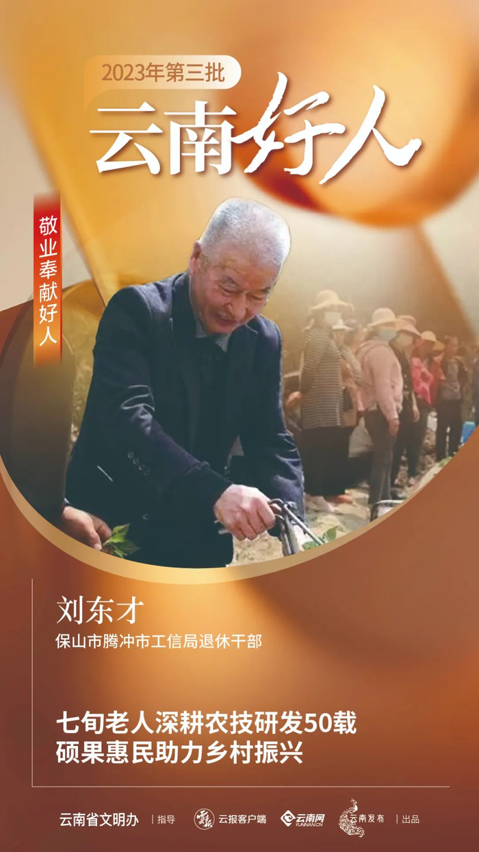 刘东才,男,1948年5月生,中共党员,保山市腾冲市工信局退休干部。不管在什么岗位,刘东才把主要的时间、精力都投入到工作和农业新技术新产品的开发上。他先后研发和推广了多个受农民欢迎的专利产品,用科技助农,有效减轻了农民农业生产的辛劳。如今,已年过七旬的刘东才依旧扎根于田间地头,将对土地的热爱、农民的牵挂转化为一项项惠农技术,助力乡村振兴。他先后被国家科技部表彰为“星火科技先进工作者”,被云南省科技厅认定为“云南省科技特派员”。