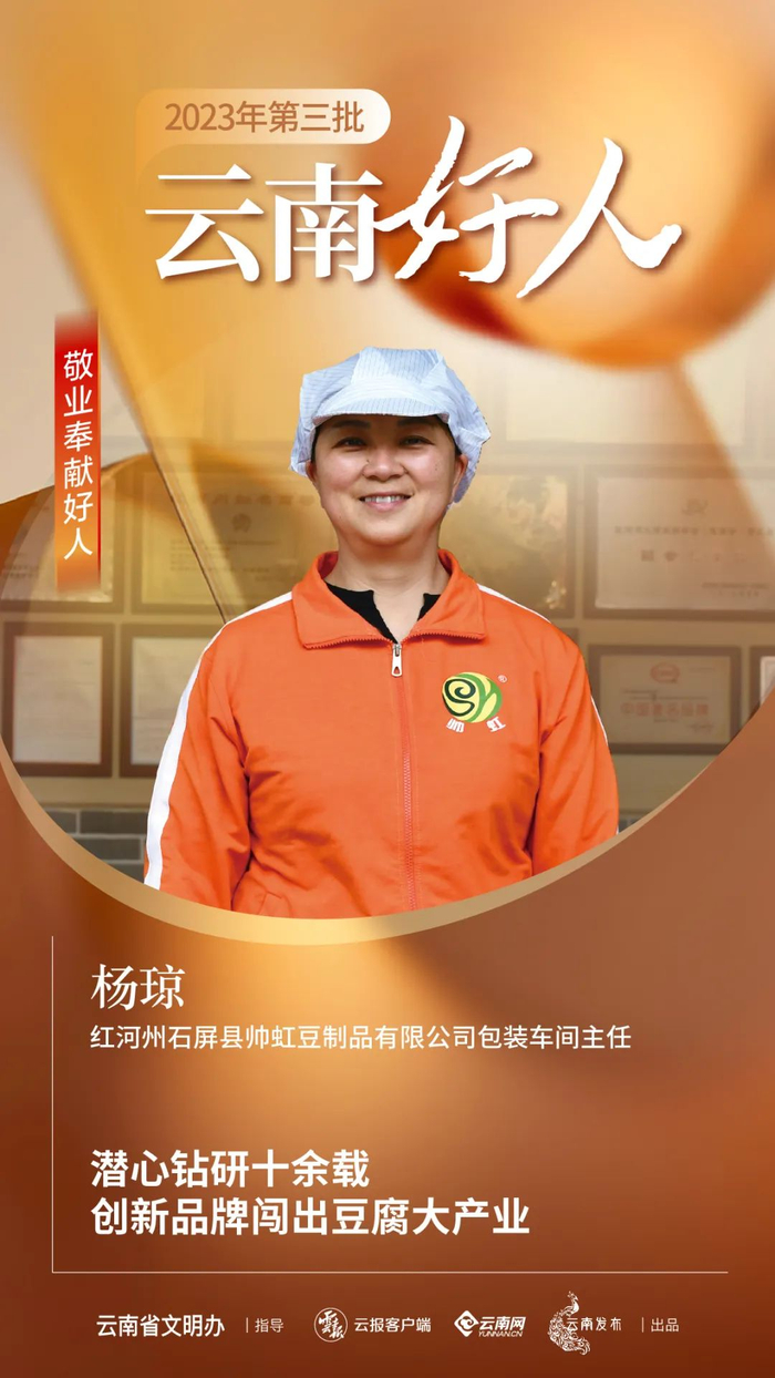 杨琼,女,汉族,1980年4月生,中共党员,红河州石屏县帅虹豆制品有限公司包装车间主任。杨琼始终把产品质量放在企业生产的第一位,严格执行生产工序和工艺标准,严把产品质量关。面对严峻的市场竞争形势,杨琼带领团队刻苦钻研,使产品在激烈的市场竞争中站稳了脚跟。她先后获得“红河州劳动模范”“云南省劳动模范”“全国五一巾帼标兵”“红河好人”“红河州道德模范”等荣誉。