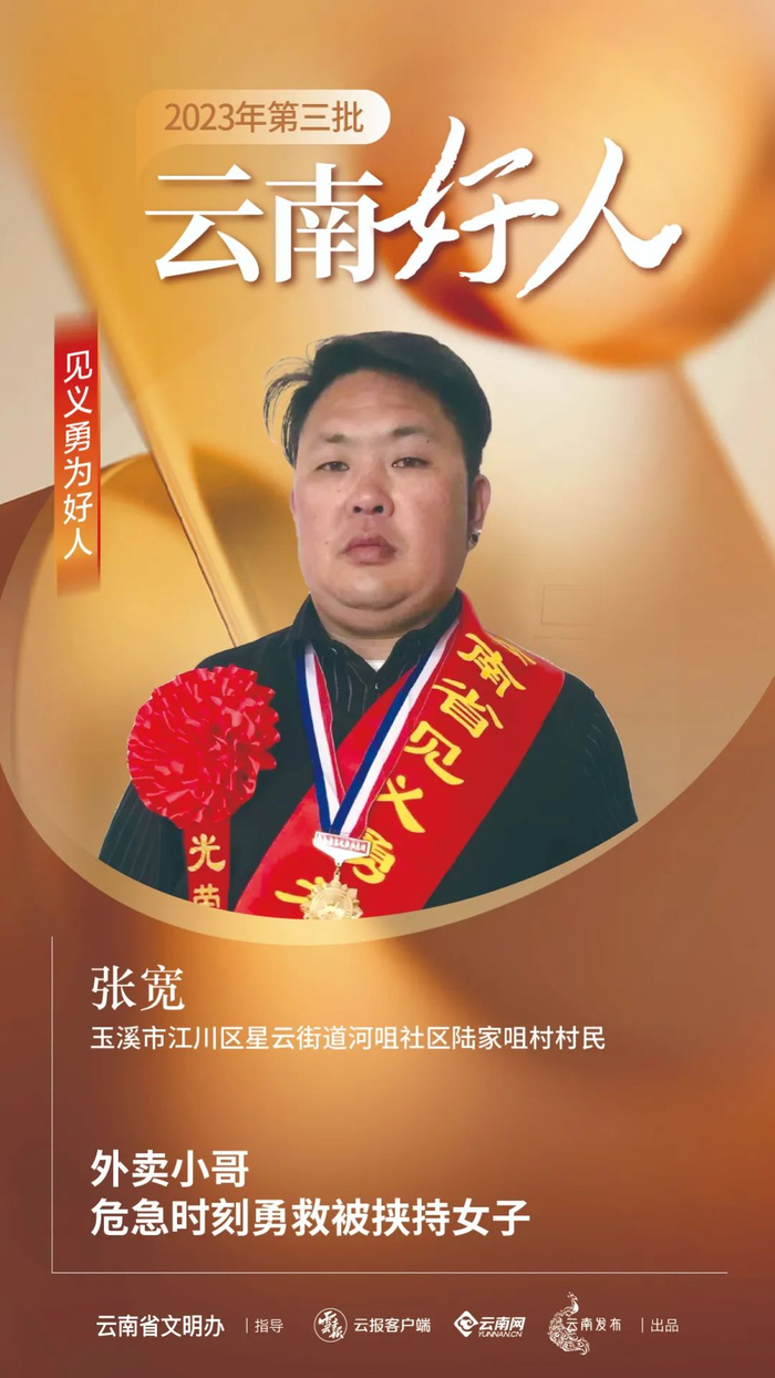张宽,男,1983年生,玉溪市江川区星云街道河咀社区陆家咀村村民。2022年8月24日中午,张宽在一家餐厅内等待取餐时,遇到一名持刀歹徒挟持一名女子。他挺身而出,与另外两名外卖小哥合力将歹徒制服,成功解救被挟持女子,维护了餐厅安全。张宽作为成员之一,获得云南省“见义勇为先进群体”荣誉。