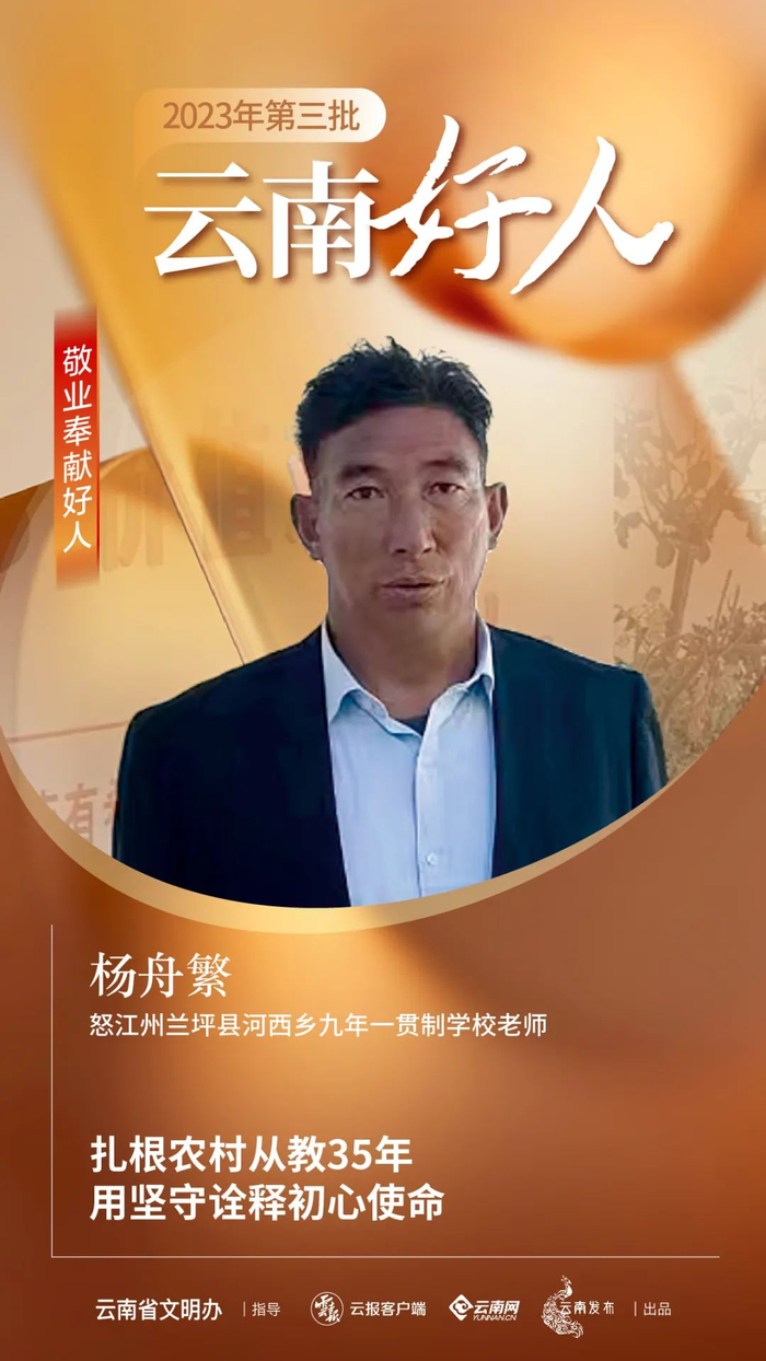 杨舟繁,男,1969年7月生,中共党员,怒江州兰坪县河西乡九年一贯制学校老师。1988年至今,杨舟繁扎根山区教育事业,用心用情用力抓好教学。他不仅帮助孩子们走进学校接受教育,还为困难学生垫付课本、文具等费用。在杨舟繁和其他老师的共同努力下,学校越办越好,孩子们一个接一个走出大山。他用35年的坚守诠释了一名教师的初心和使命,被表彰为“云南省优秀教师”。