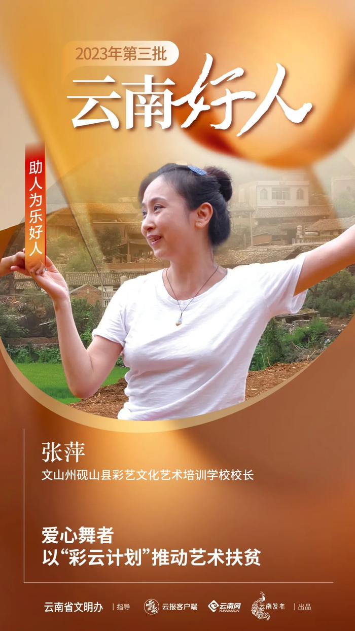 张萍,女,1970年生,文山州砚山县彩艺文化艺术培训学校校长。她牵头发起了助力乡村文化发展的“彩云计划”公益活动。活动开展以来,张萍夫妇利用寒暑假到砚山县那夺村为当地留守儿童和孤儿教授舞蹈课,组织孩子们到外地参加表演等文化活动,帮助60多名孩子到云南省艺术学院附中、昆明市艺术学校等院校继续学习舞蹈,为孩子们开阔眼界、提升素质积极创造机会。