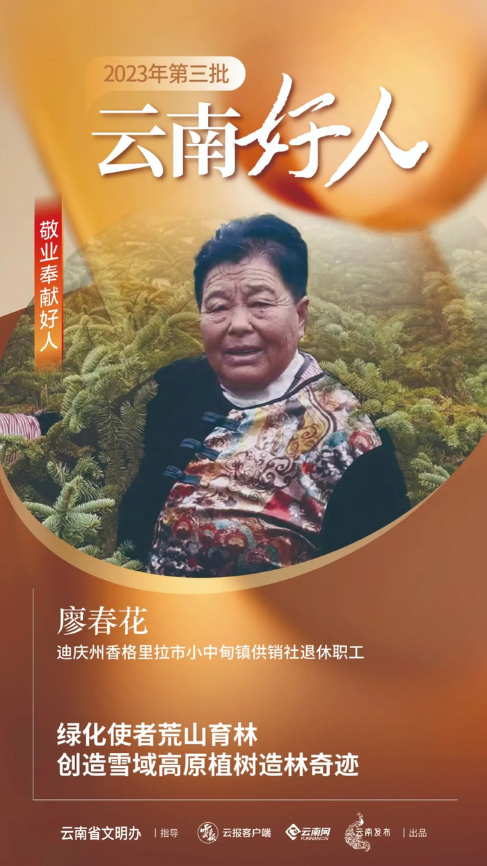 廖春花,女,1940年生,中共党员,迪庆州香格里拉市小中甸镇供销社退休职工。多年来,廖春花带领村民在荒山植树300多万株,总计育林15400亩,让曾经的一片片荒坡再披绿装。廖春花牵头成立苗圃种植农民专业合作社,有效带动当地村民增收。她先后获得“三八绿色奖章”“全国绿化奖章”“云南省劳动模范”“全国十大绿化女状元”等荣誉。