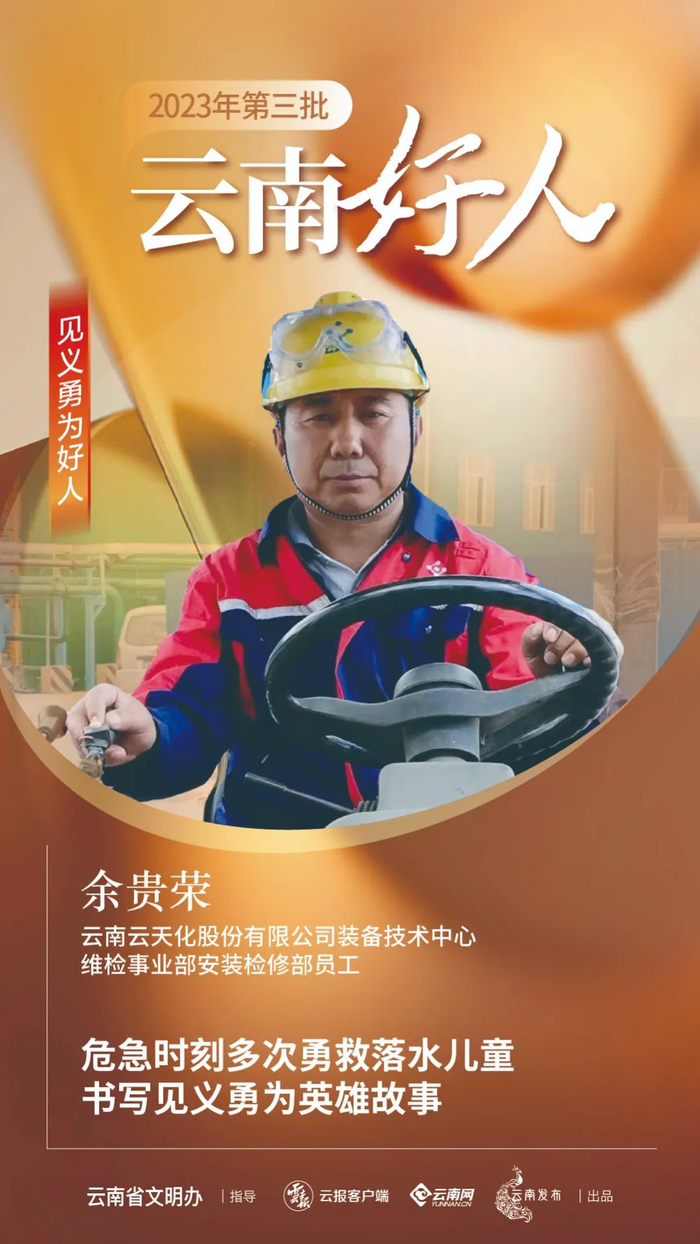 余贵荣,男,1979年10月生,云南云天化股份有限公司装备技术中心维检事业部安装检修部员工。2023年6月3日,余贵荣途经宁湖公园(安宁)发现有小孩落水,他立刻翻过三米高栏,跳入水中施救,在后续赶到的群众的协助下,成功救起落水小孩。余贵荣见义勇为不留名,被救孩子的家人最后是通过网络媒体才找到了他。多年来,余贵荣不顾个人安危,一次次挺身而出,先后救起过5名落水儿童,书写了见义勇为的英雄故事。
