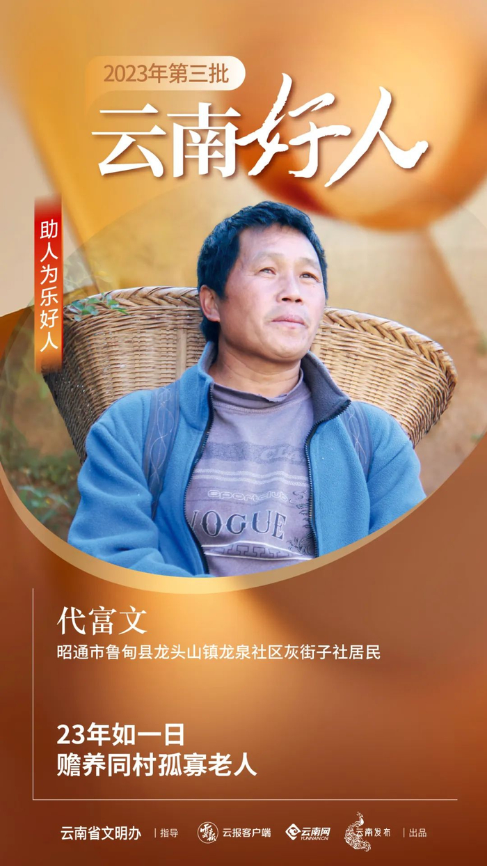 代富文,男,1972年生,昭通市鲁甸县龙头山镇龙泉社区灰街子社居民。二十多年来,他无偿照顾同村孤寡老人雷云昌,用自己的实际行动诠释了中华民族助人为乐、爱老敬老的传统美德,他照顾雷云昌老人的事迹成为十里八乡群众交口称赞的佳话。
