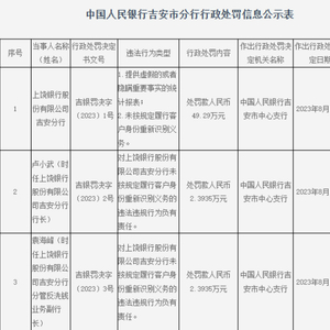 8月17日,中国人民银行吉安市分行发布的行政处罚信息公示表(吉银罚决字〔2023〕1号、2号、3号)显示,上饶银行股份有限公司吉安分行存在以下违法行为类型:提供虚假的或者隐瞒重要事实的统计报表;未按规定履行客户身份重新识别义务。