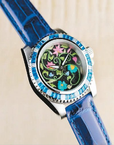 说话间,杨华珍抬起手腕让笔者看她戴的手表。表盘上绣着羊角花等精美图案,令人眼前一亮。杨华珍介绍,这是今年为香港赛马会开发的“马场有礼”文创产品,很受市场欢迎。