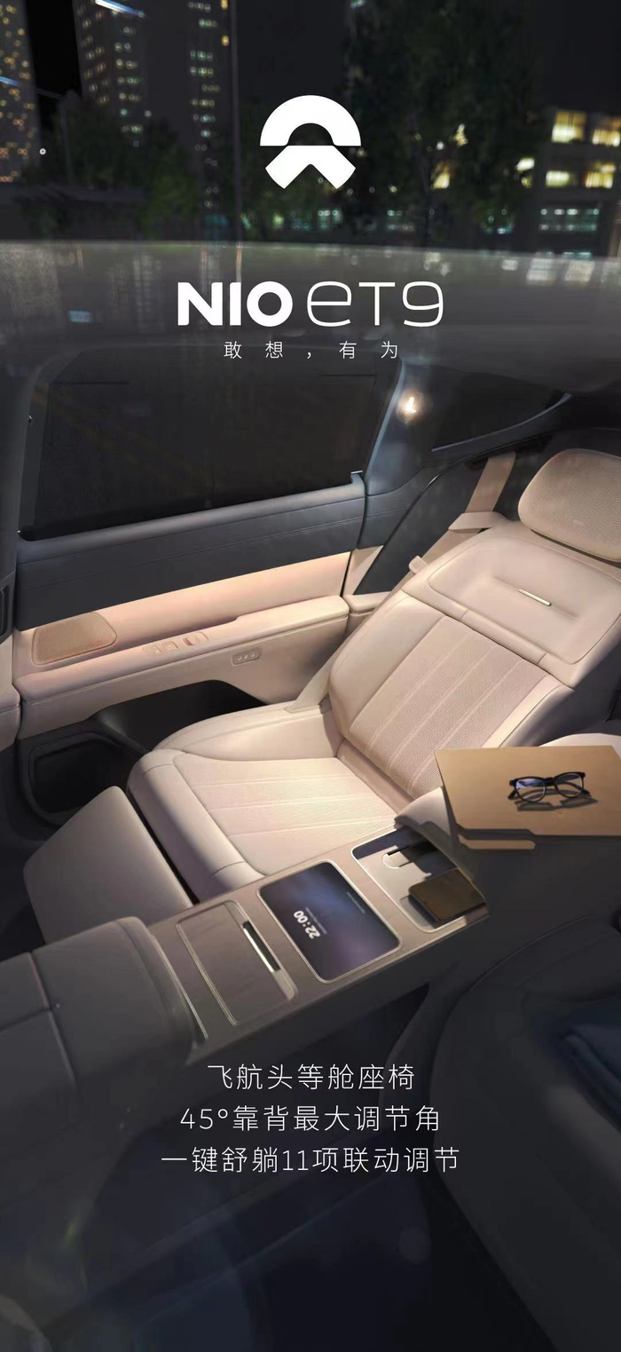 蔚来ET9的后排飞航头等舱座椅拥有24项自研专利技术,自研同级唯一“滑躺式行政座椅”,最大靠背调节角度达45°,582mm的座垫宽度、一键舒躺11项联动调节,舒适体验远超同级。