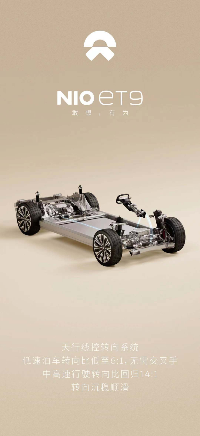蔚来ET9的“SkyRide·天行智能底盘系统”首次将线控转向、后轮转向和全主动悬架三大核心硬件系统集成在一起,是目前全球唯一的全线控智能底盘。