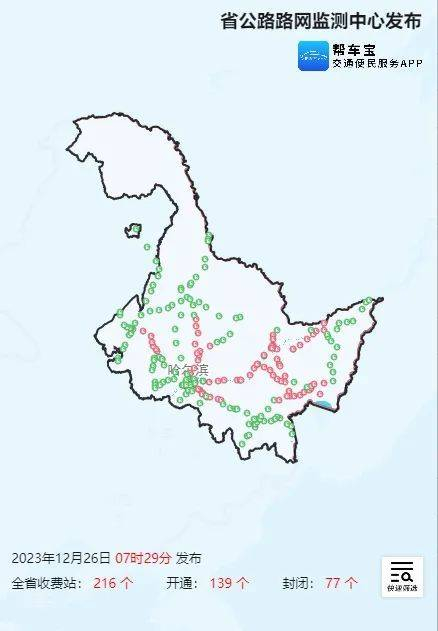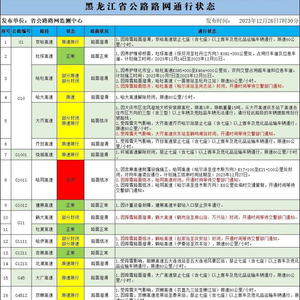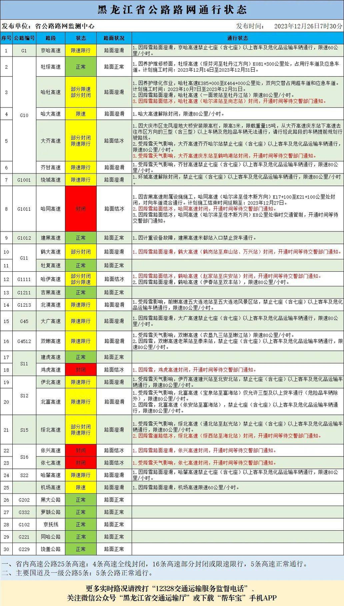 12月26日7时30分汇总路况信息:因降雪路面湿滑,全线封闭的高速有(4条高速):鸡虎高速、依兴高速、依七高速、哈同高速封闭。部分封闭的高速有(5条高速):大齐高速(庆东站至鹤鸣湖站)、鹤哈高速(赵家站至庆安站)、哈牡高速(哈尔滨站至尚志站)、绥北高速(绥西站至海北站)、鹤大高速(鹤岗站至麻山站、万兴站)封闭。开通时间等待交警部门通知。限速限行的高速有(16条高速):双嫩高速(农垦九三站至嫩江站)、哈牡高速(一面坡站至牡丹江站)、鹤哈高速(伊春站至双丰站)、哈大高速限速80公里/小时。伊北高速、绥北高速(通北站至赵光站)、北漠高速、大广高速、哈肇高速、哈尔滨绕城高速、双嫩高速(泰来站至老莱站)、北富高速(依安站至富海站)、齐甘高速、大齐高速(齐齐哈尔站),禁止七座(含七座)以上客车及危化品运输车辆通行,限速80公里/小时。北富高速(宝泉站至富海站)仅允许三型及以上货车通行(危险品车辆除外),限速80公里/小时。京哈高速禁止七座(含七座)以上客车及危化品运输车辆通行,限速60公里/小时。机场高速限速60公里/小时。省内其它高速路况正常。