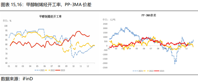 展望2024年,目前烯烃利润接近盈亏平衡,装置开工率基本已经打满,后续增长空间有限。国内烯烃产能已突破1800万吨,逐步进入产能过剩阶段,装置投产积极性下降,且煤化工作为高能耗产业,受双碳及经济性双重压制,国内烯烃暂无新投产项目。另外,近几年沿海地区丙烷脱氢、乙烷裂解以及大炼化装置持续投产,加之烯烃单体和聚烯烃也处于产能过剩周期,价格重心不断下移,外采烯烃单体的经济性显著优于外采甲醇制烯烃,因此预计后期有条件的烯烃企业或改为外采单体生产终端产品来缓解自身综合利润,MTO工艺将面临替代风险,落后产能存在淘汰可能,后续或出现存量博弈,对甲醇的需求增量恐有限。