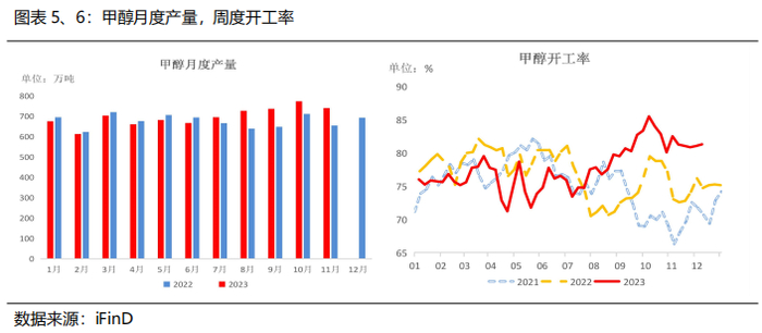 2023年国内甲醇总产能约10700万吨,同比增速约4.97%,其中煤制甲醇装置仍占比第一,焦炉气制甲醇产能新增明显,占比提高至14%,另外,二氧化碳加氢制甲醇,即绿醇项目增幅几十万吨,投产工艺趋向低碳化。1-11月累计产量7669.38万吨,同比增长3.22%,其中上半年,除去常规春检,煤制甲醇生产利润亏损导致开工持续偏低,每月产量均低于去年同期;下半年,随着利润修复及新增产能释放,开工逐步回升,在10月中旬达到近三年最高点85.49%,后续受检修、环保安检和冬季限气等因素影响,开工略有下滑,但仍维持同期高位,全年平均开工负荷为77.78%,略高于去年。