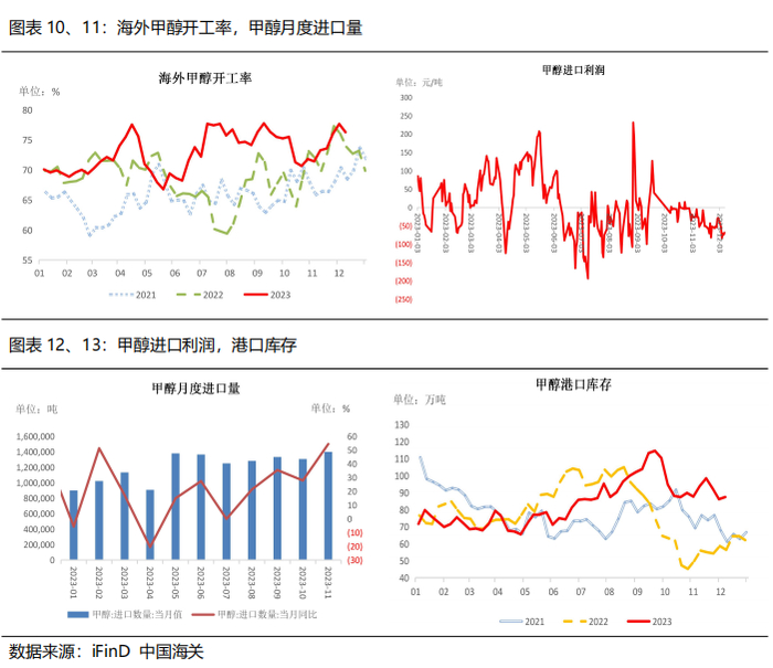 展望2024年,作为全球最大甲醇消费国,中国仍面临进口货源冲击。除去一季度季节性停车,海外存量装置运行基本稳定,国内进口量的年度变化与国外新产能的投放进度有较大关系,新增产能集中在伊朗及美国,根据计划,伊朗将有两套165万吨甲醇装置,美国共有320万吨装置,另外马来西亚还有一套175万吨装置计划在2024年投产。因此,在进口利润仍存,海外开工相对稳定,再加上新增产能较多,国内仍面临高进口量冲击,港口高库存或成为常态,或促进进口甲醇倒流内地市场,但需考虑海外气源供应以及内外差价变化等因素。
