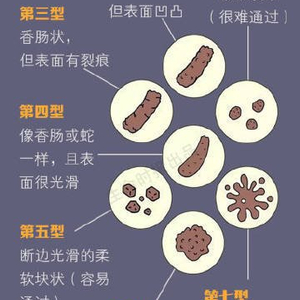 除了次数,便便的颜色、气味和形状也很重要。英国布里斯托尔皇家医院的医生绘制了布里斯托尔大便图。这个图将大便分为7类,通过对照,你可以判断出自己的便便属于哪种类型。需要提醒的事,第一型和第二型表示有便秘;第三型和第四型是理想的便形,尤其第四型是最容易排便的形状;第五至第七型则代表可能有腹泻。
