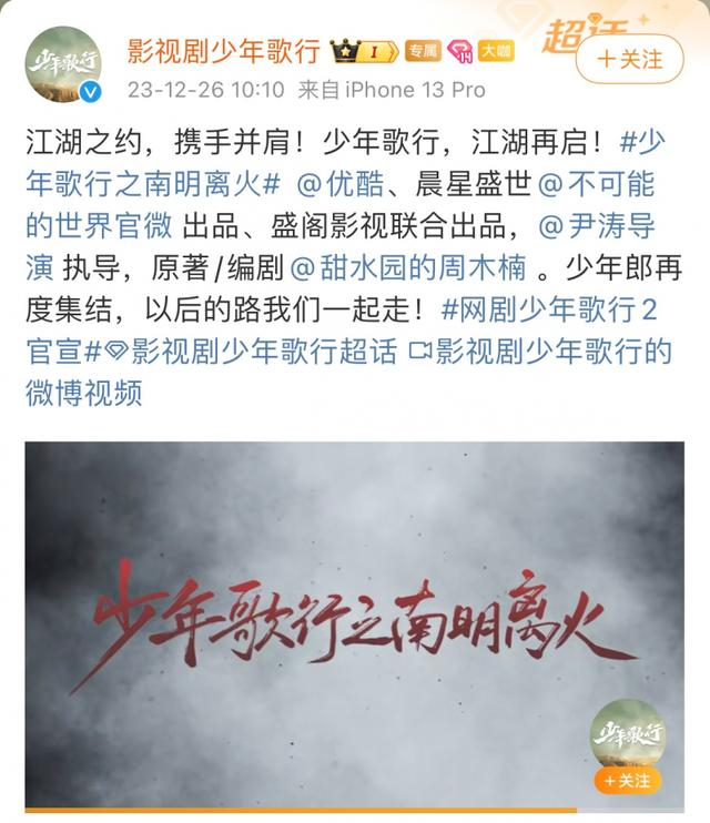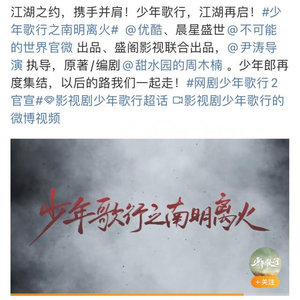 今天(26日)是新武侠剧《少年歌行》开播一周年的日子,北京青年报记者发现,《少年歌行》官方微博发布了将启动第二季《少年歌行之南明离火》的消息,出品方优酷、导演尹涛、原著作者暨编剧周木楠、演员李宏毅、林博洋、敖瑞鹏、李欣泽、戴燕妮、邓凯、范津玮等齐齐转发。