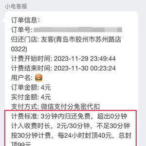 沟通过程中,小电客服回复给代先生的计费标准:“3分钟内归还免费,超出0分钟计入收费时长,2元/30分钟,不足30分钟按30分钟计费,每24小时封顶40元,总封底99元。”根据这一收费标准,代先生对自己的一笔显示7分钟的订单提出质疑:“时长7分钟,按标准应收2元,为什么扣费3元?看来小电系统存在不少问题!”