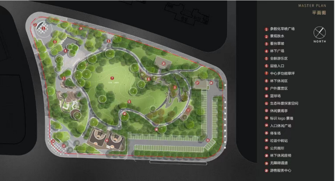 其中,HUO悦社区公园整体面积2.2万平方米,基调为活力生态,里面不仅有各类广场以及全龄游乐区这种市政公园的标配,还有各类满足年轻人及现代家庭所需的配置。例如,公园配置了一个滑板广场,通过三组异形花池穿插,把场地分隔成林下休闲空间以及滑板运动空间。同时,还有两个半场篮球场、专门的户外露营区、儿童游乐区。公园还配置了多个广场,功能十分齐全,基本上和朋友们的聚会、周末带小孩,在家门口就可以完全满足。