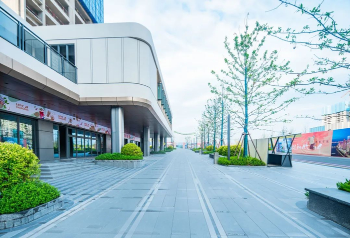 HUO悦街区是个十字路口,左手边是一个两层独栋商业,适合做会所或者咖啡厅、西餐厅等业态,前方J区沿街是两层高的商业街,适合开早点店、面包店、奶茶店、水果店等满足日常所需。这个三角区整体构成一个活力街区,整体偏年轻活力化。而独栋商业后面就是九年一贯制学校,可想而知未来这条商业街会有多热闹。