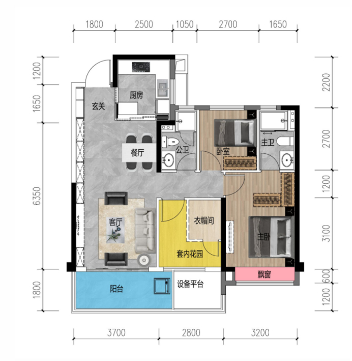 99㎡户型功能区域分布非常清晰,客厅、餐厅一体化设计,直通阳台,入户即拥有阔绰的空间感;玄关设置了一键关灯系统,方便实用;厨房交标配备方太品牌的中高档全套设备(包含燃气灶、油烟机),提供高品质生活体验;公共卫生间淋浴屏双移门的设计,能最大限度地增加门的开启宽度;主卧融合小家化理念,配备独立卫生间,干湿分区;另外还带有一个飘窗,使得主卧室内更加明亮、温馨。