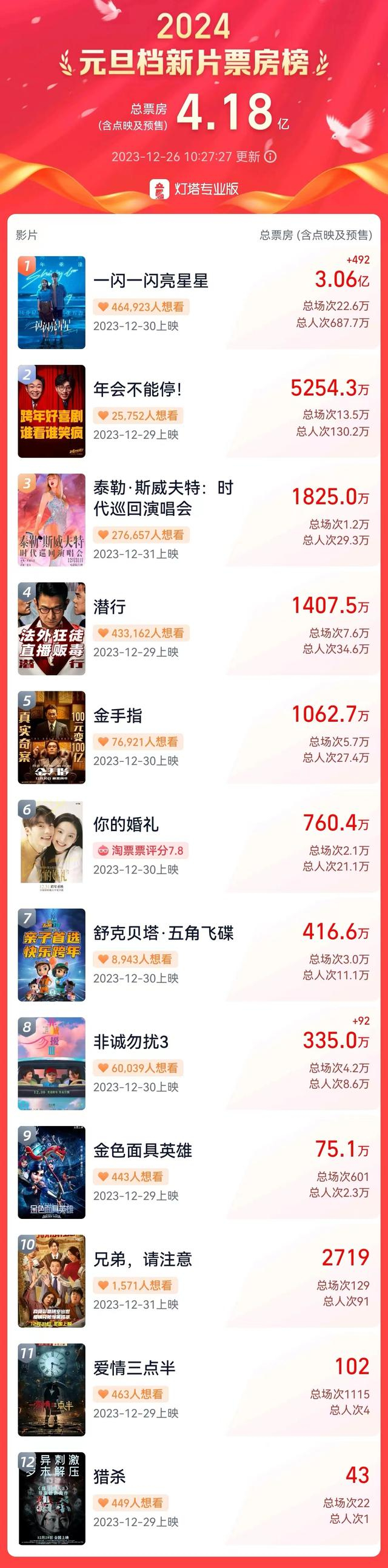 元旦将至,多部将在元旦假期上映的影片已开启点映或预售。今(26)日,灯塔专业版出炉了《2024元旦档新片票房榜》,总票房(含点映及预售)达4.18亿元。其中,电影《一闪一闪亮星星》以3.06亿元票房荣登榜首。《年会不能停!》以5254.3万元排名第二,《泰勒·斯威夫特:时代巡回演唱会》《潜行》《金手指》均以1000余万元票房紧随其后。