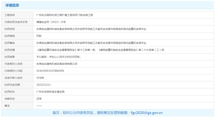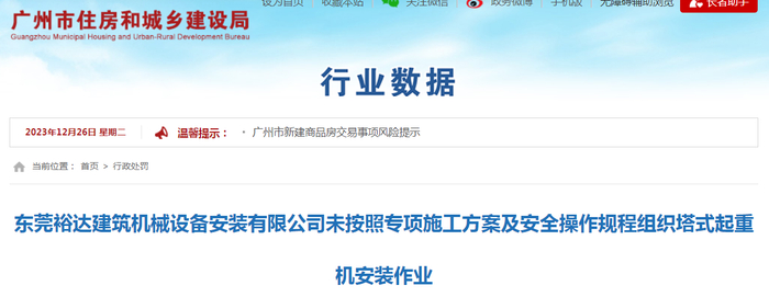 东莞裕达建筑机械设备安装有限公司未按照专项施工方案及安全操作规程组织塔式起重机安装作业