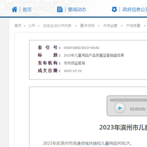 【山东滨州】2023年滨州市儿童用品产品质量监督抽查结果