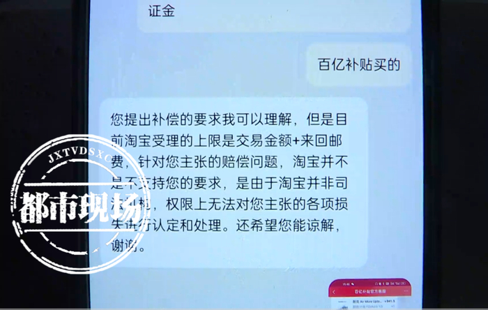 而根据百亿补贴承诺,消费者在百亿补贴购买商品并收到货后,若百亿补贴确认该商品“非正品”,商家需向消费者退还商品的实际成交金额,并向消费者支付商品实际成交金额的十倍作为赔偿。然而小侯却表示,在提出十倍赔偿要求后,淘宝方面表示无法支持。