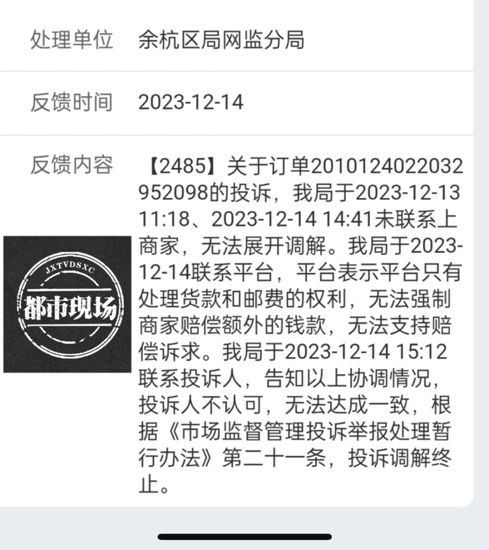 都市现场记者注意到,12315平台反馈信息显示,浙江省杭州市余杭区局网监分局未联系上商家,无法展开调查,淘宝平台表示平台只有处理贷款和邮费的权利,无法强制商家赔偿额外的钱款,无法支持赔偿诉求。投诉人对此不认可,无法达成一致,投诉调解在12月14日已经终止。