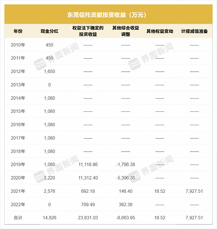2019年至2022年期间,按照“权益法下确定的投资收益”进行统计,东莞信托还为其创造投资收益2.38亿元。