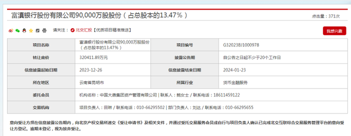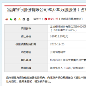 北京产权交易所官网显示,中国大唐集团财务有限公司拟将持有的富滇银行9亿股股权挂牌转让,约占富滇银行总股本的13.47%,转让底价约为32.04亿元,信息披露起始日为2023年12月26日。