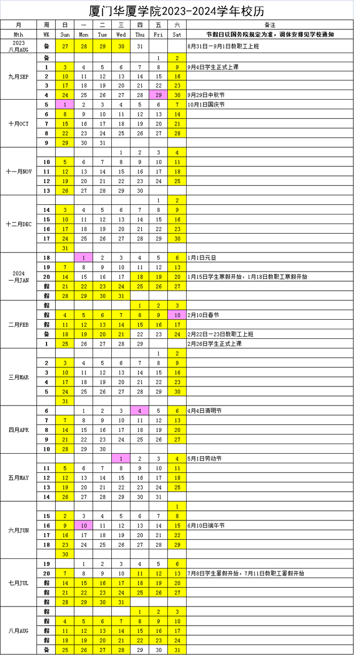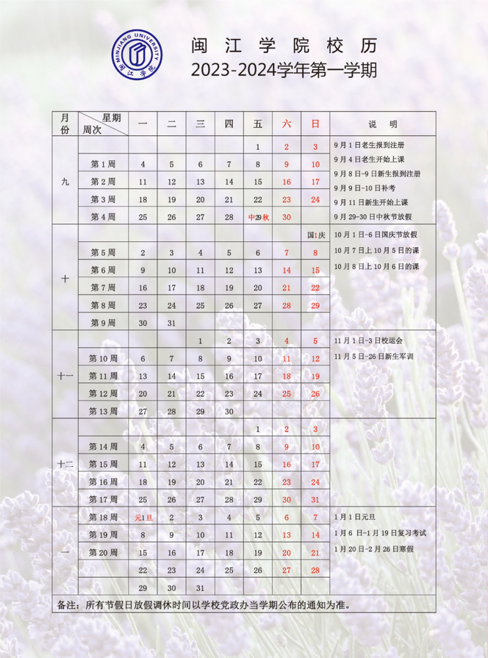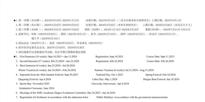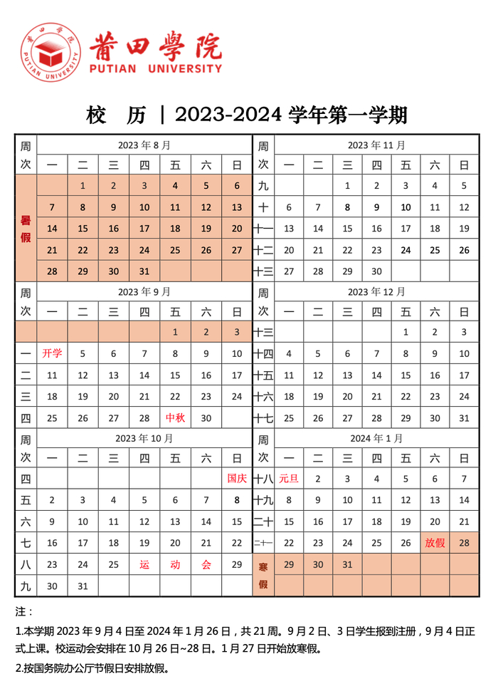 2023年8月31日(星期四)注册,9月1日(星期五)正式上课,2024年1月26日(星期五)学期结束。