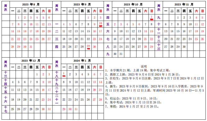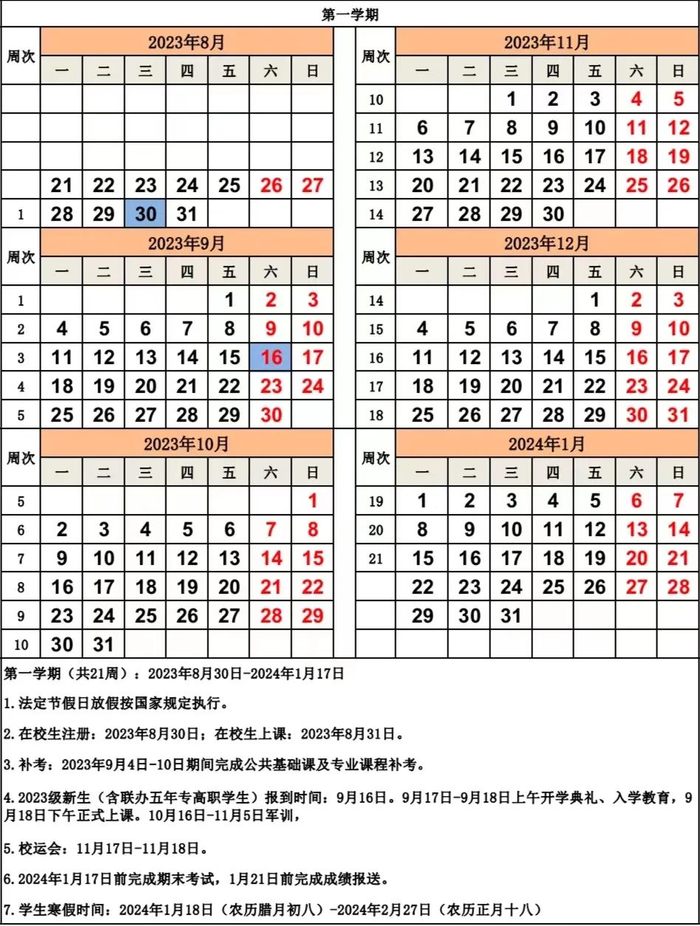 2023年8月31日(星期四)开学注册,2023年9月1日(星期五)正式上课,2024年1月31日(星期三)学期结束。