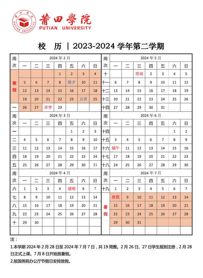 2024年2月19日(农历正月初十,星期一)注册,2月20日正式上课,2024年7月7日(星期日)学期结束。